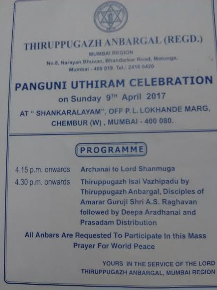 மும்பையில் பங்குனி உத்திர திருவிழா செம்பூர் சங்கராலயா வளாகத்தில்ஏப்ரல் 9 ம் தேதி ஞாயிற்றுக் கிழமை 4.15 மணி அளவில் பூஜா விதிகளுடன் தொடங்கி இசை வழிபாடு நடை பெற உள்ளது.அன்பர்கள் பெருமளவில் கலந்து கொண்டு முருகப்பெருமானின் அருள் பெற வேண்டுகிறோம்.